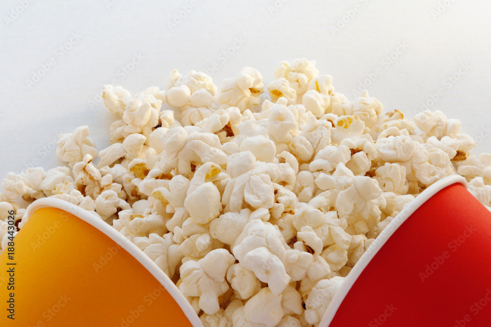 Red And Yellow Paper Cup And Popcorn On A White Background Diet Weight Loss Snack Gluten Free Eat National Day Food In The Movie Theater Stock Photo Adobe Stock